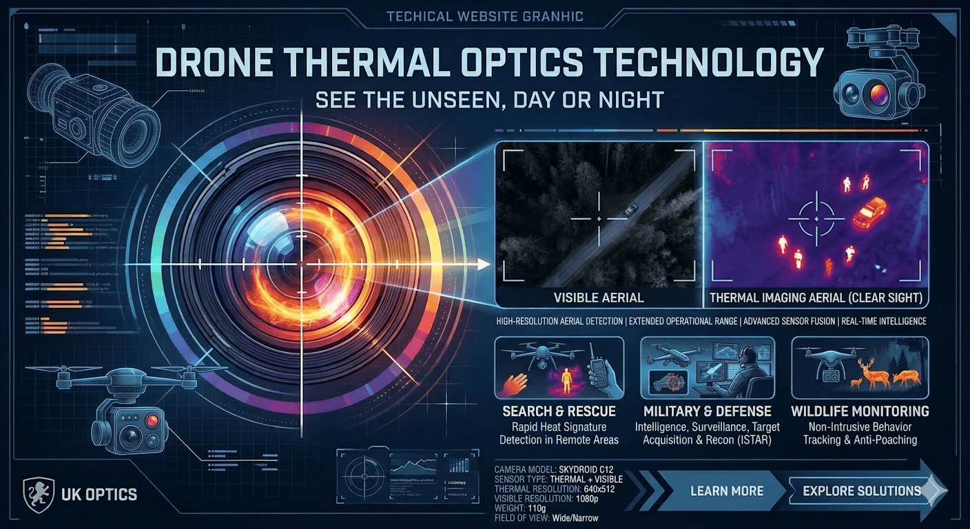 To ensure maximum mission flexibility, we offer optional high-performance thermal systems as modular upgrades for our smaller tactical platforms, such as the Eagle 7 and RSI Shpak. These interchangeable payloads utilize high-sensitivity VOx bolometer sensors that provide clear thermal resolutions of up to 640×512 pixels, allowing heat signatures to be identified even at significant tactical distances. By opting for this dual-sensor architecture, operators gain the ability to toggle between a 10x/20x digital zoom daylight camera and a thermal lens with a sub-50mK thermal sensitivity, penetrating total darkness, smoke, and foliage while maintaining a crisp, low-latency H.264/H.265 video link